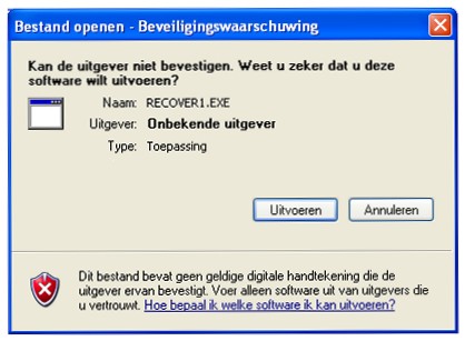 Krijgt u eerst nog een soortgelijke Windows melding als hierboven, klik dan op de button 'Uitvoeren' om het herstellen te starten. Indien het herstellen niet lukt, neem dan contact op met de Helpdesk.
